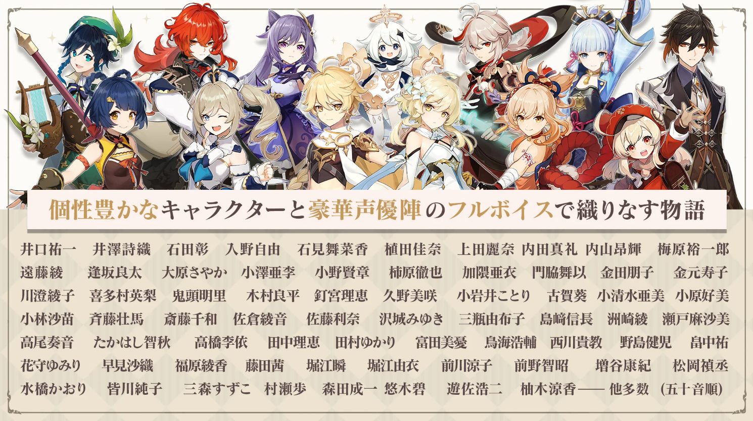 その魅力をさらに高めているのが、豪華な声優陣によるフルボイス対応です。たとえば、雷電将軍には沢城みゆき、楓原万葉には島﨑信長など、演技力に定評ある声優がキャラの性格と背景をリアルに表現。キャラクター同士の会話やストーリー中の語りかけが自然で、まるで彼らと旅をしているような錯覚に陥るほどです。