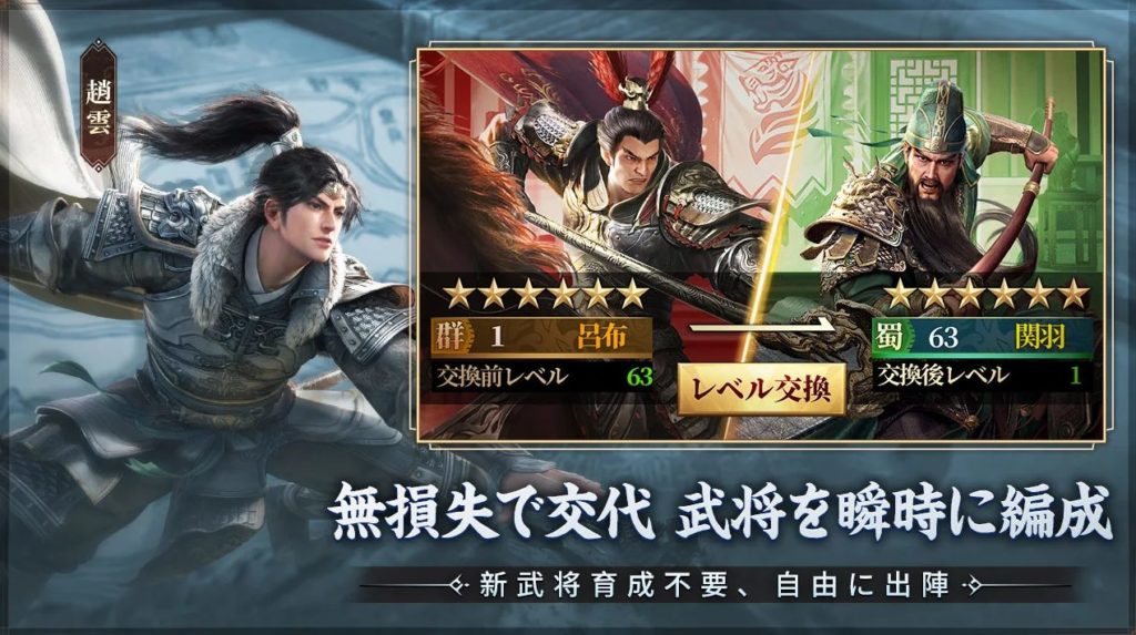 たとえば、Lv60まで鍛えた張遼を、手に入れたばかりの周瑜に交換すれば、周瑜は一瞬でLv60に。武将変更のたびに時間を浪費することなく、環境に応じた最適編成を組み替えられるのです。