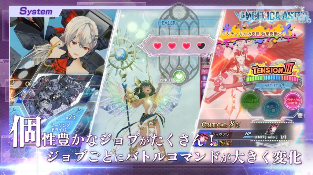 『ANGELICA ASTER』の戦闘は、王道コマンドRPGをベースとしながらも、“ジョブ切り替えシステム”によって常に戦略が問われるものとなっています。登場キャラクターはファイターやブラスター、スナイパーといった11の基本ジョブのうち1つに所属し、それぞれ異なる役割とスキルを持ちます。