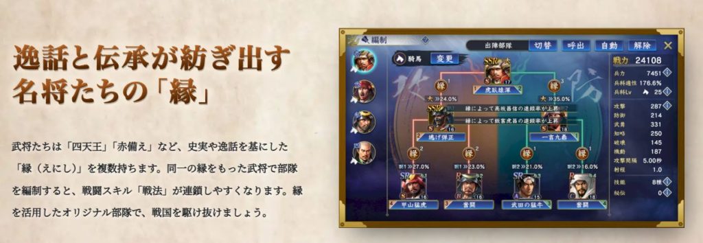 さらに、注目すべきは「縁(ゆかり)システム」です。これは、特定の武将同士を同じ部隊に編成することで“連携戦法”が発動しやすくなるというシステム。たとえば、織田信長と柴田勝家、羽柴秀吉などを編成すると、連鎖戦法の発生率が飛躍的に上がり、一斉攻撃のような大ダメージが期待できます。